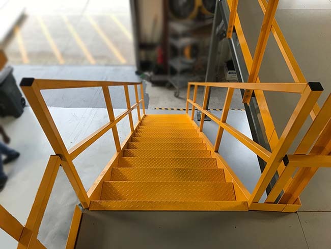 For stair systems to be compliant with OSHA code, the structure must first only be for the use of workers with no access to the public. Overall, They can include areas like factory floors and manufacturing spaces where only designated employees work. Therefore, they are not bound by the IBC. Instead, the Occupational Safety and Health Administration’s Fixed Industrial Stair regulations (1910.24) govern the design, construction and use of both interior and exterior stairs used to access equipment, machinery, tanks, elevated platforms, other floors or pits. Looking at the standards for an OSHA approved stair system, we are going to factor in five main areas of note: the slope of the stairs, the risers & tread, stair width, safety railing, and the stair system’s landing.