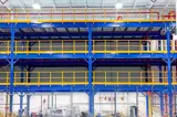 The first mezzanine measured 28 feet by 60 feet, while the second spanned 32 feet by 70 feet. Both were powder-coated blue with yellow handrails and equipped with ResinDek flooring on all levels. Multiple six-foot pivot gates were added to improve material handling, allowing forklifts to load items directly onto each level.