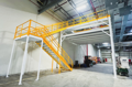 The structure includes white beams and columns paired with performance yellow handrail for visibility and safety. It also features under mezzanine lighting, powered by a modular wiring system. This system made it easy to install seven light fixtures beneath the diamond plate decking, illuminating the space below and simplifying the electrical integration.