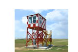 Access is provided via an OSHA-compliant stair and landing system, complete with bar grating treads and bright yellow powder-coated handrails. The tower’s exterior is finished in a bold aviation checkerboard pattern of orange and white, helping it stand out in an airfield environment.