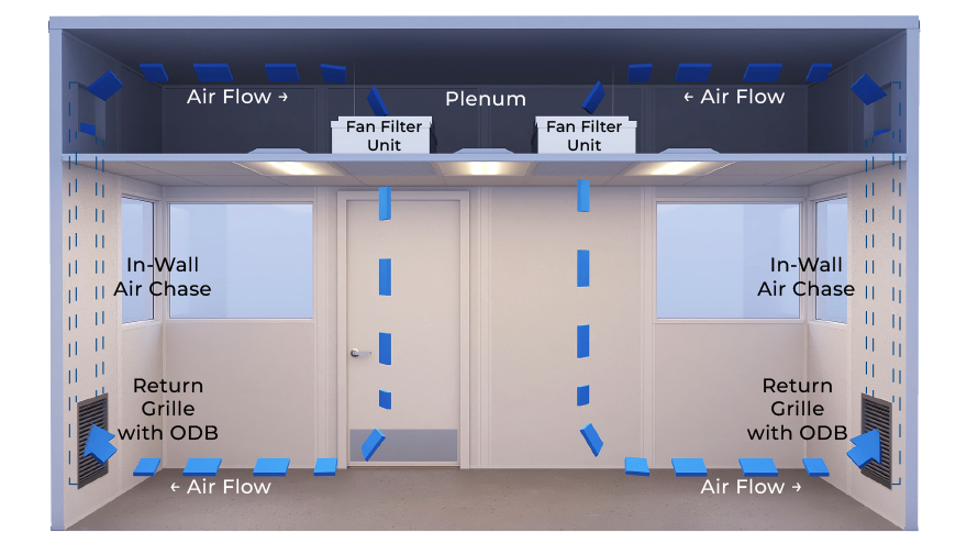 Our modular cleanroom systems integrate advanced HEPA and ULPA filtration, ensuring up to 99.99% removal of airborne particles. Additional airflow control options include: